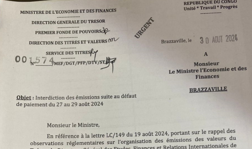 30. 604 705 800 de fcfa, c'est le montant exact que le Congo n'a pas pu rembourser à ses créanciers, sur la période du 27 au 29 août 2024, révèle la correspondance, dont nous avons obtenu copie, que le directeur général du trésor, Albert Ngondo, a adressée le 30 août 2024 au