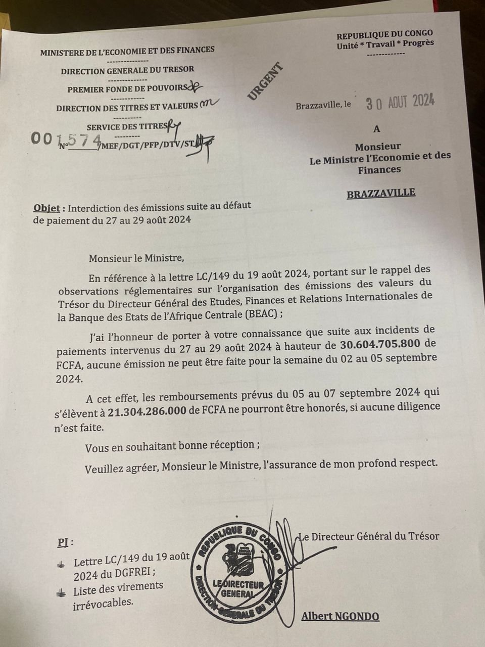 30. 604 705 800 de fcfa, c'est le montant exact que le Congo n'a pas pu rembourser à ses créanciers, sur la période du 27 au 29 août 2024, révèle la correspondance, dont nous avons obtenu copie, que le directeur général du trésor, Albert Ngondo, a adressée le 30 août 2024 au